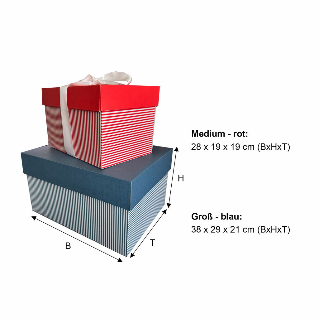 Hochwertiges Material: Dieses tolle Set umfasst zwei unterschiedlich große Kartons, die aus stabilem Papierkarton gefertigt sind. Die Größen variieren: Medium (rot) 28 x 19 x 19 cm und Groß (blau) 38 x 29 x 21 cm.