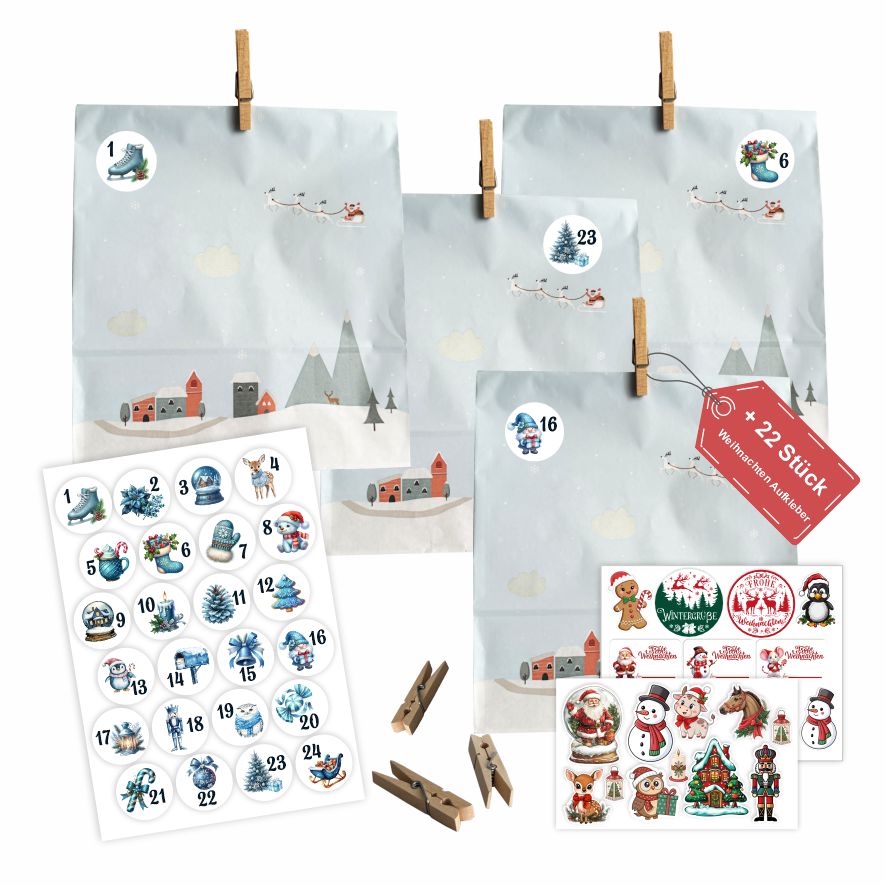 🎄 EINZIGARTIGER INHALT: Dieses Adventskalender Set ist die perfekte Möglichkeit, die Vorfreude auf Weihnachten zu erhöhen! Es enthält 24 bedruckte Geschenktüten (27 x 33 x 10 cm), 24 Adventsaufkleber mit Zahlen (4,5 cm), 24 Holzklammern (7,3 x 1 cm) und 22 Weihnachtsaufkleber (zwischen 1,2x3 cm und 5,3x7cm). Jedes Element ist sorgfältig ausgewählt, um Ihnen die individuelle Gestaltung Ihres Adventskalenders zu erleichtern und ein festliches Ambiente zu schaffen.