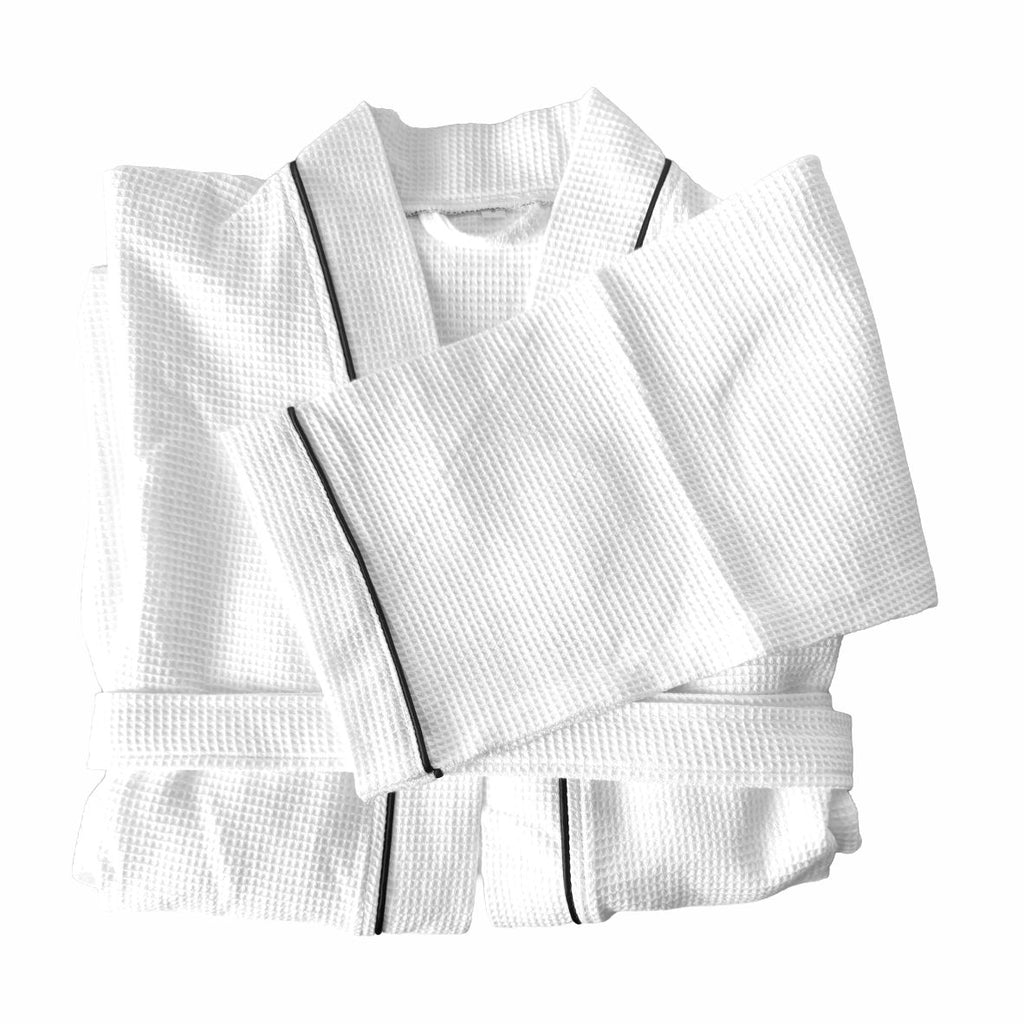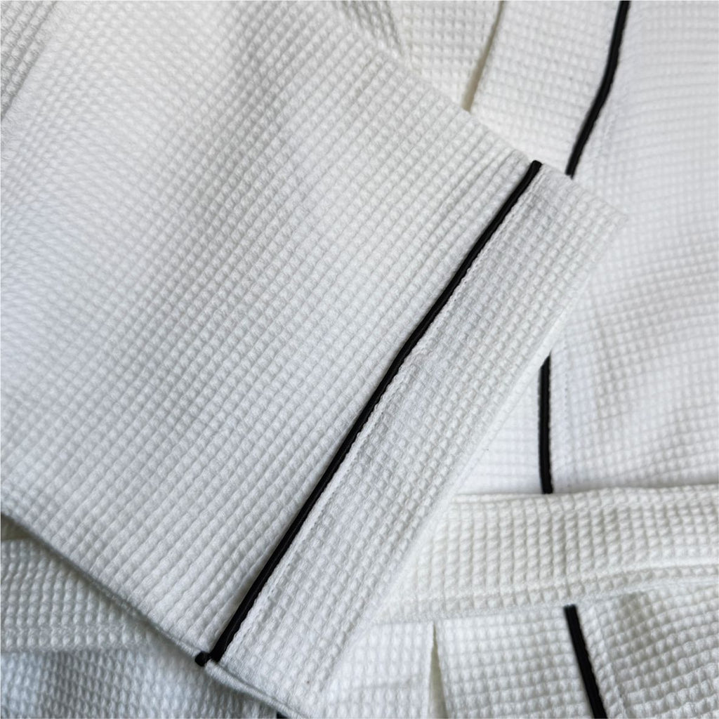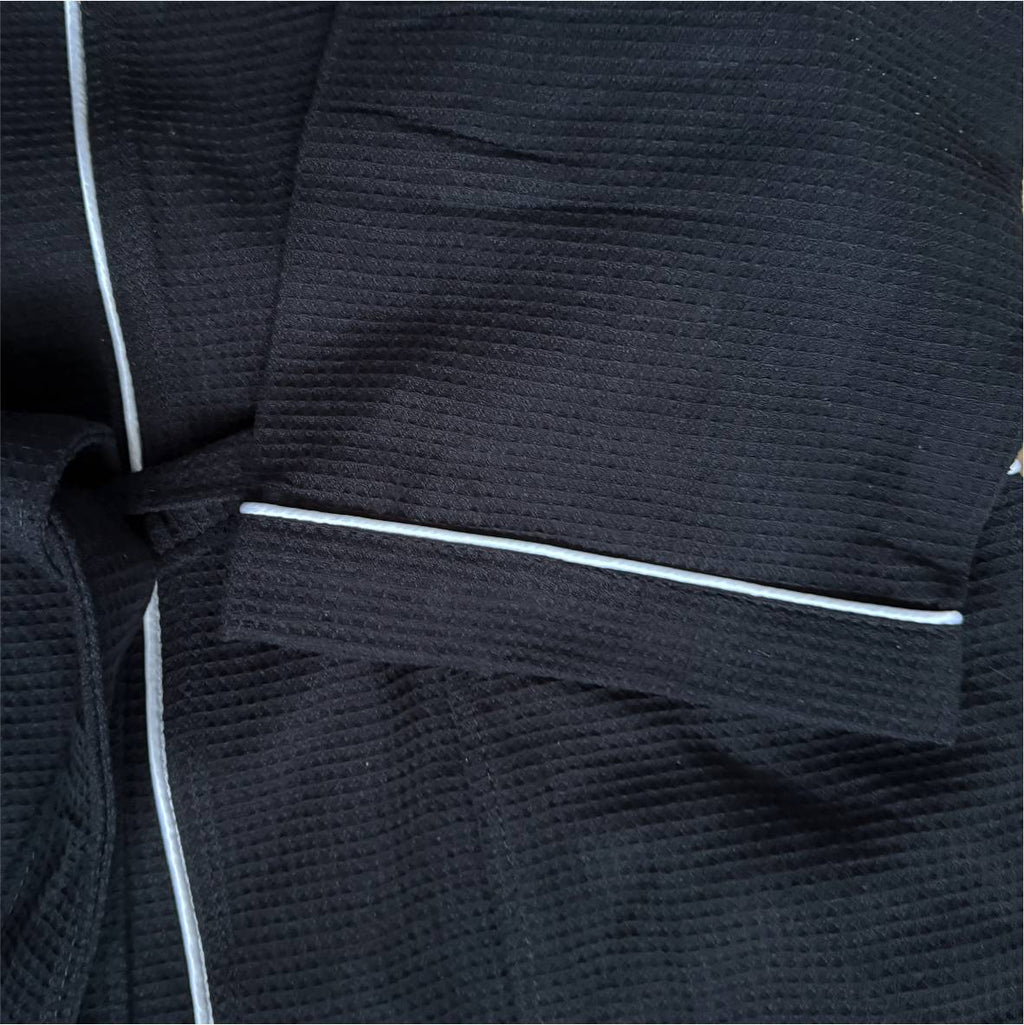 Waffelmuster: Die charakteristische dreidimensionale Waffelstruktur ist mehr als nur ein Designelement. Sie vergrößert die Oberfläche des Stoffes, wodurch Feuchtigkeit extrem schnell aufgenommen wird. Gleichzeitig ermöglicht die Struktur eine optimale Luftzirkulation, was den Bademantel in Rekordzeit trocknen lässt.