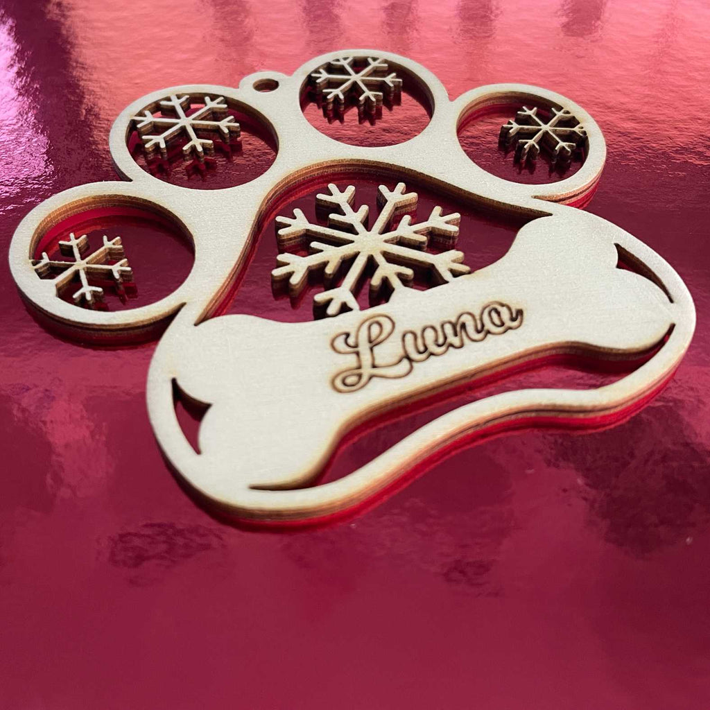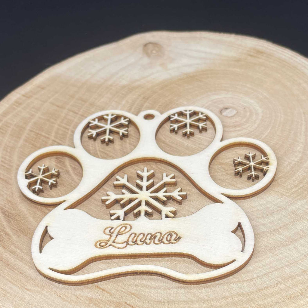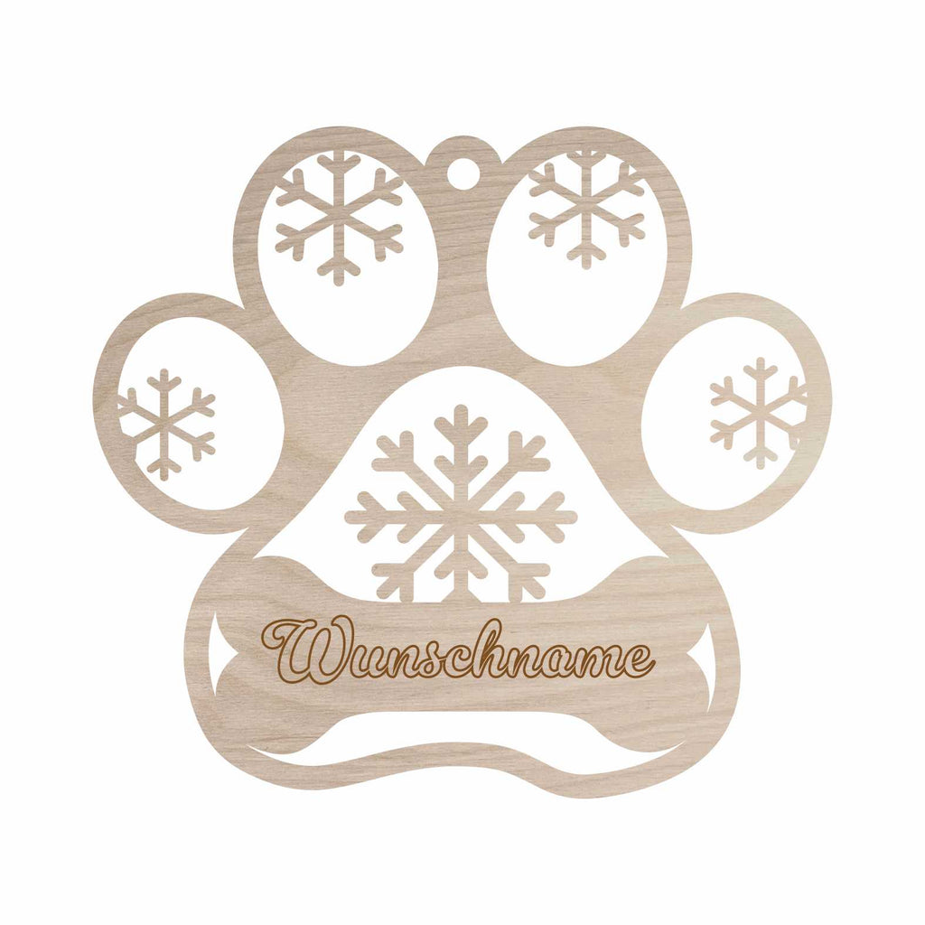 Weihnachtsbaumkugel aus natürlichem Birkensperrholz mit Namen - Pfote Hund / Katze